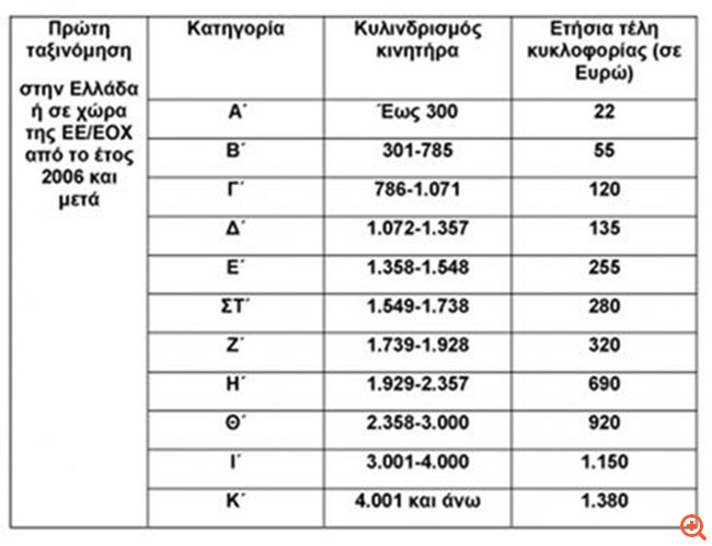 Θα πρέπει να σημειωθεί ότι τα τέλη κυκλοφορίας υπολογίζονται με βάση τους εκπεμπόμενους ρύπους για τα οχήματα τα οποία έχουν ταξινομηθεί για πρώτη φορά (στην Ελλάδα για τα καινούρια και στην Ευρώπη για τα μεταχειρισμένα εισαγόμενα) από την 1η Νοεμβρίου 2010 και μετά. Η κλίμακα υπολογισμού των ετήσιων τελών για τα οχήματα αυτά έχει ως εξής: