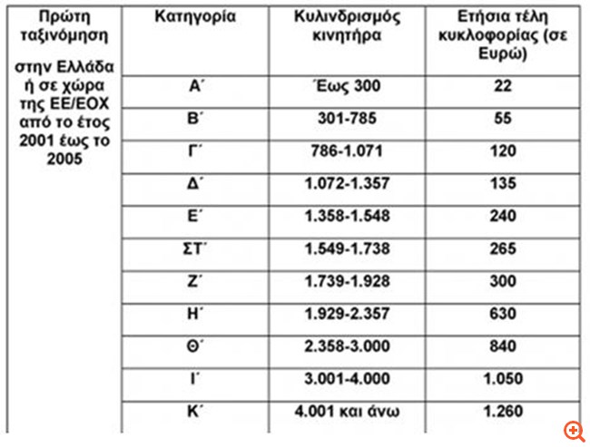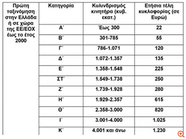 Σε ό,τι αφορά στα υπόλοιπα οχήματα, δηλαδή αυτά που έχουν ταξινομηθεί έως τις 31 Οκτωβρίου 2010 και τα τέλη υπολογίζονται με βάση τον κυβισμό και το έτος ταξινόμησης, δεν αναμένονται αλλαγές. Τα τέλη κυκλοφορίας για αυτά τα ΙΧ έχουν ως εξής: